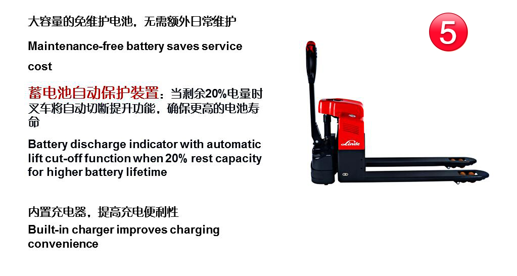 特點:多種充電機可供選擇,標準以及快速充電機。帶開關的懸浮站板可以吸收震動,站板橡膠墊使叉車操作舒適。